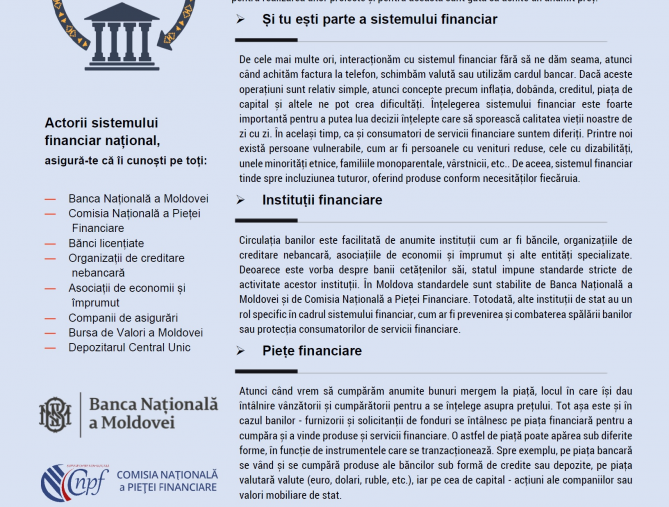 Vreți să știți ce este un credit și cum să vă protejați de supraîndatorare, să înțelegeți cum funcționează sistemul financiar din Republica Moldova și să aflați cum să vă majorați veniturile prin propriile investiții? La aceste, dar și la alte întrebări veți afla răspunsurile din seria de materiale informative lansate astăzi de Banca Națională a Moldovei (BNM),împreună cu Comisia Națională a Pieței Financiare (CNPF).