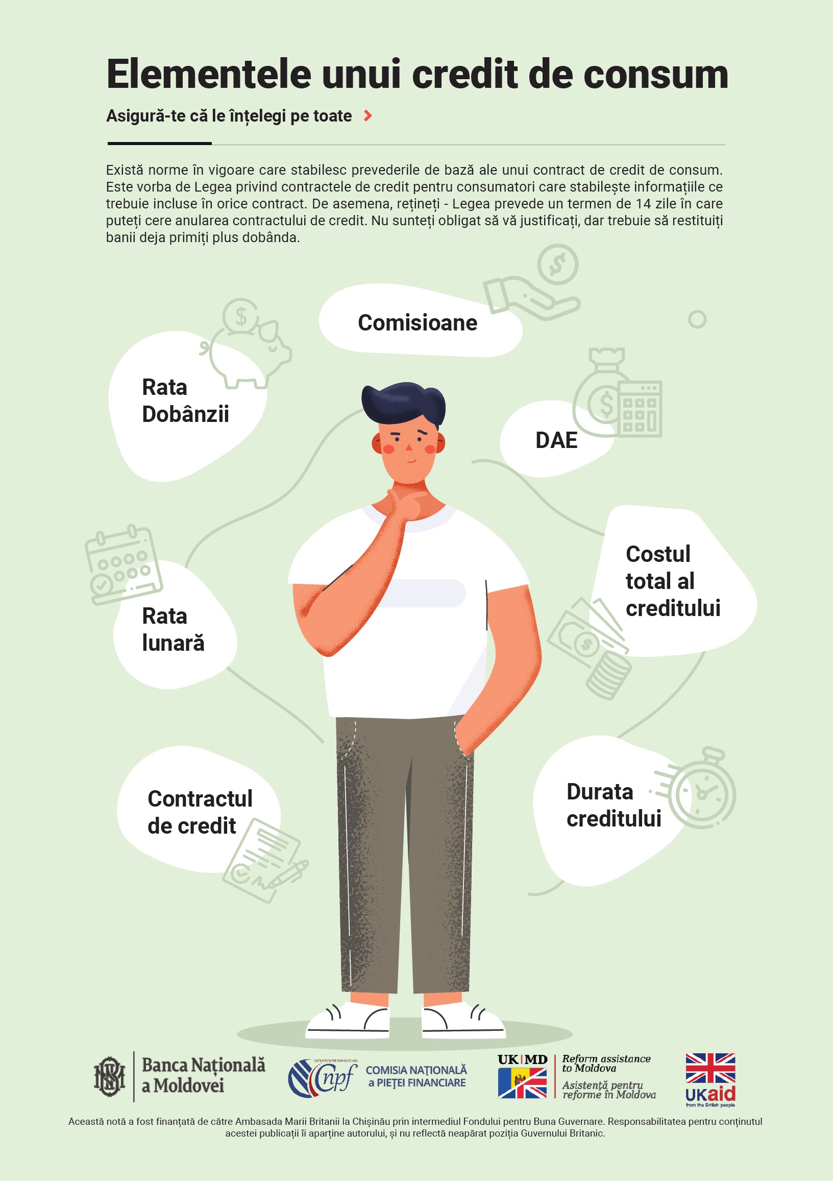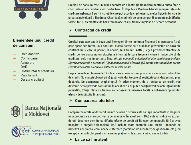 Creditul de consum este un avans acordat de o instituție financiară pentru a putea face o cheltuială atunci când nu aveți destui bani. În Republica Moldova băncile și organizațiile de creditare nebancară sunt instituțiile care pot acorda credite persoanelor fizice în funcție de situația individuală a fiecăreia. Chiar dacă creditele de consum pot fi acordate sub diferite forme, totuși elementele de bază rămân aceleași și trebuie înțelese de fiecare persoană.