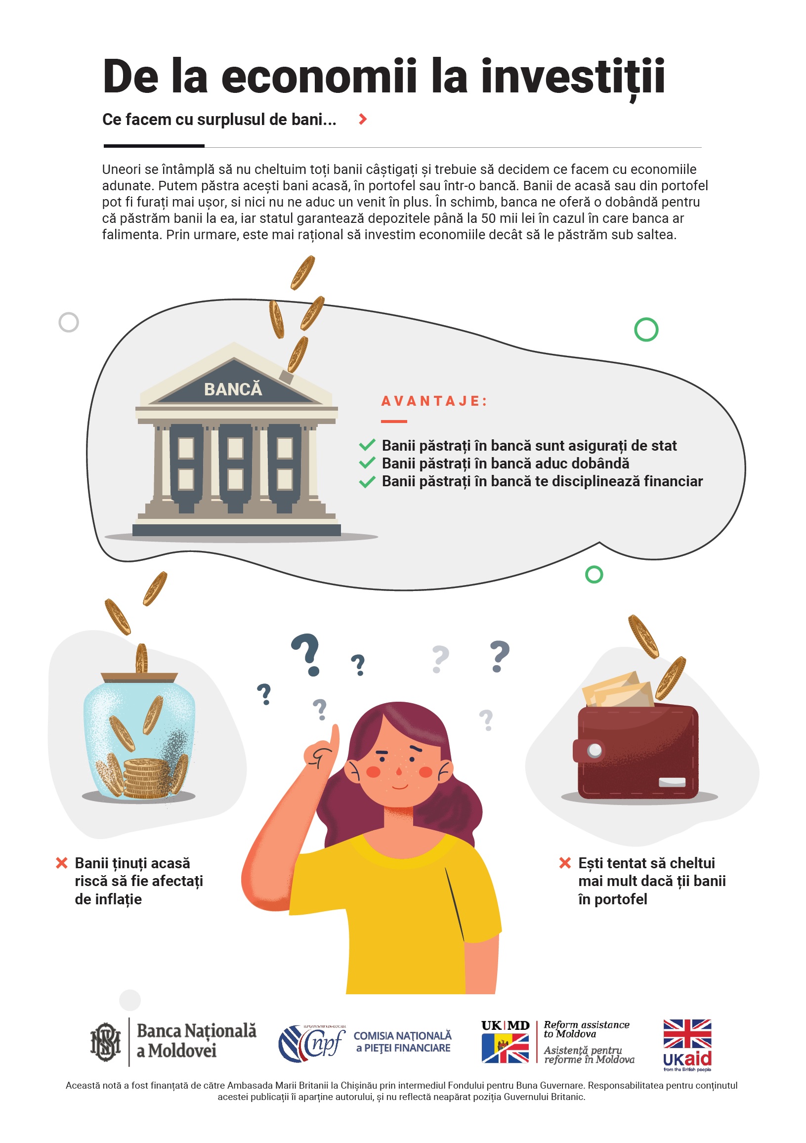 Pentru unele categorii de persoane banii păstrați la bancă pot reprezenta economii stringente pentru viața de zi cu zi, cum ar fi salariul, pensia, ajutorul de șomaj sau indemnizația persoanelor vulnerabile. Statul asigură depozitele plasate în băncile din Republica Moldova prin intermediul Fondului de Garantare a Depozitelor în Sistemul Bancar (FGDSB). Acesta garantează rambursarea în caz de faliment a băncii atât a depozitelor în lei cât și a celor în valută străină. Totuși, atenție - nu toată suma este rambursată. Indiferent de numărul depozitelor și mărimea lor, plafonul de garantare stabilit la moment este de 50 mii de lei.