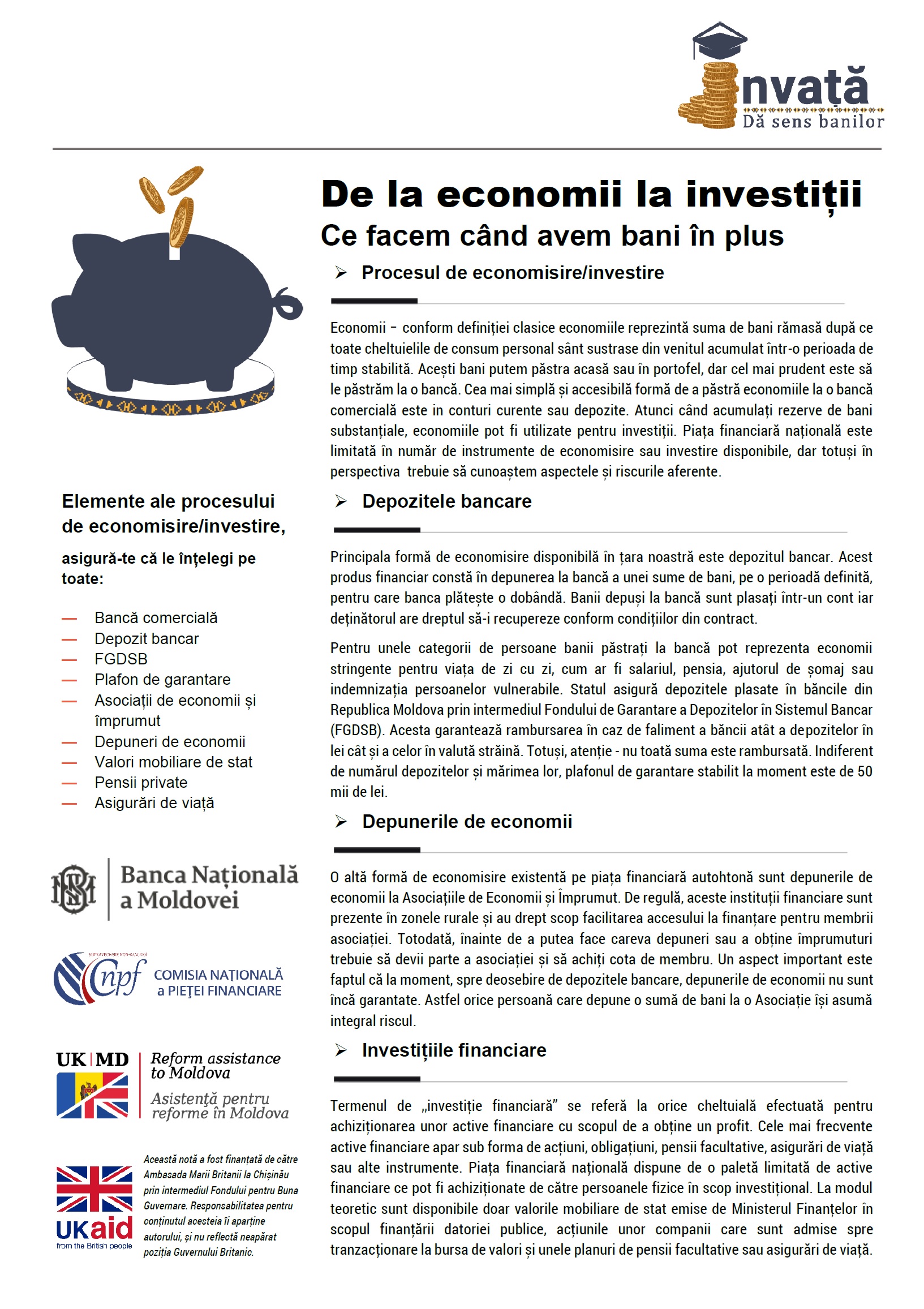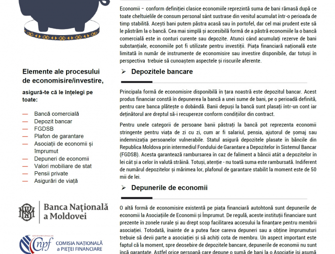 Economii – conform definiției clasice economiile reprezintă suma de bani rămasă după ce toate cheltuielile de consum personal sânt sustrase din venitul acumulat într-o perioada de timp stabilită. Acești bani putem păstra acasă sau în portofel, dar cel mai prudent este să le păstrăm la o bancă. Cea mai simplă și accesibilă formă de a păstră economiile la o bancă comercială este în conturi curente sau depozite. Atunci când acumulați rezerve de bani substanțiale, economiile pot fi utilizate pentru investiții. Piața financiară națională este limitată în număr de instrumente de economisire sau investire disponibile, dar totuși în perspectiva trebuie să cunoaștem aspectele și riscurile aferente.