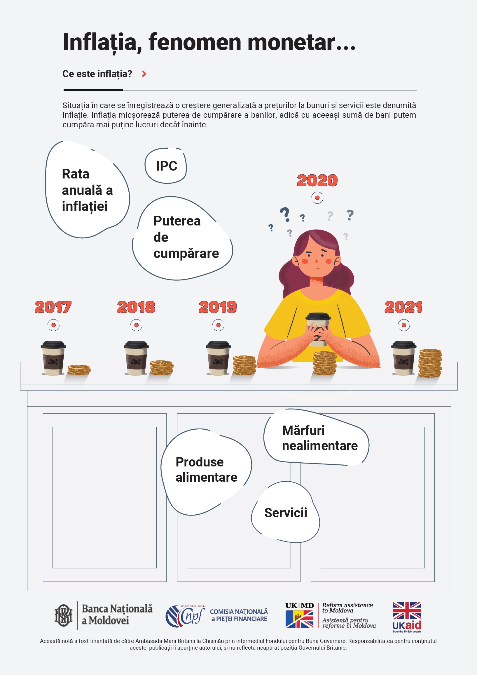 Într-o epocă a globalizării cauzele inflației pot fi diverse, acestea au rădăcini atât în interiorul țării, cât și dincolo de granițele acesteia. Printre cele mai frecvente situații putem vorbi de: (i) creșterea volumul de bani aflați în circulație (masa monetară1); (ii) creșterea prețurilor la produsele de import; (iii) creșterea cererii de bunuri sau (iv) reducerea încrederii în moneda națională. BNM este abilitată prin lege să asigure un nivel stabil al inflației – de 5% anual, acesta fiind considerat nivelul optim pentru dezvoltarea economică a țării. Această activitate poartă denumire de „politică monetară” și este implementată prin intermediul unor instrumente cum ar fi cantitatea de bani în circulație, nivelul ratei dobânzii sau cursul de schimb valutar. Totodată, BNM acordă o importanță majoră comunicării, informând periodic publicul despre deciziile de politică monetară, inclusiv evoluția inflației și perspectivele pentru următoarea perioadă.