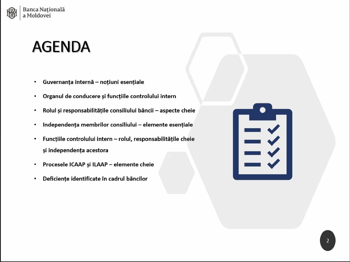 Asociaţia Băncilor din Moldova salută și este onorată să faciliteze inițiativa Băncii Naționale a Moldovei de a spori calitatea GUVERNANȚEI CORPORATIVE în sectorul bancar prin desfășurarea pe parcursul zilei de astăzi a unui seminar pentru membrii consiliilor băncilor.
